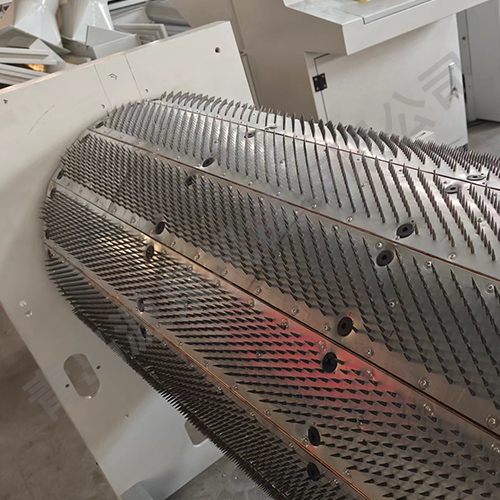 把纖維、原料經(jīng)喂入平簾輸送至喂入羅拉,再由開松輥高速開松后,經(jīng)輸棉風(fēng)機(jī)以適量的風(fēng)量輸送纖維原料供后遞工作使用。經(jīng)本機(jī)開松后的纖維、原料效果好,均勻、細(xì)致。